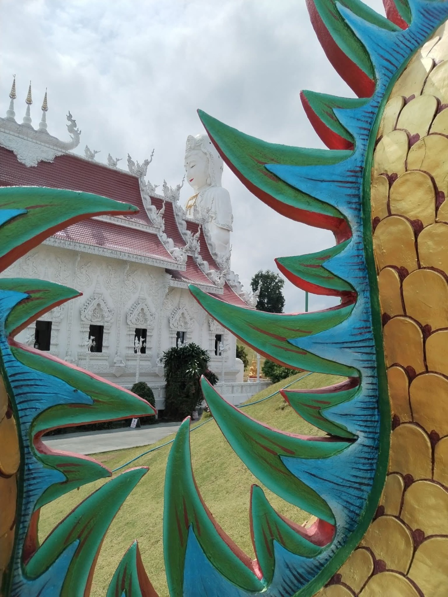 Tailândia, cidade de Chiang Rai: as cristas do dorso de um dos dragões que adornam um templo, enquadram,