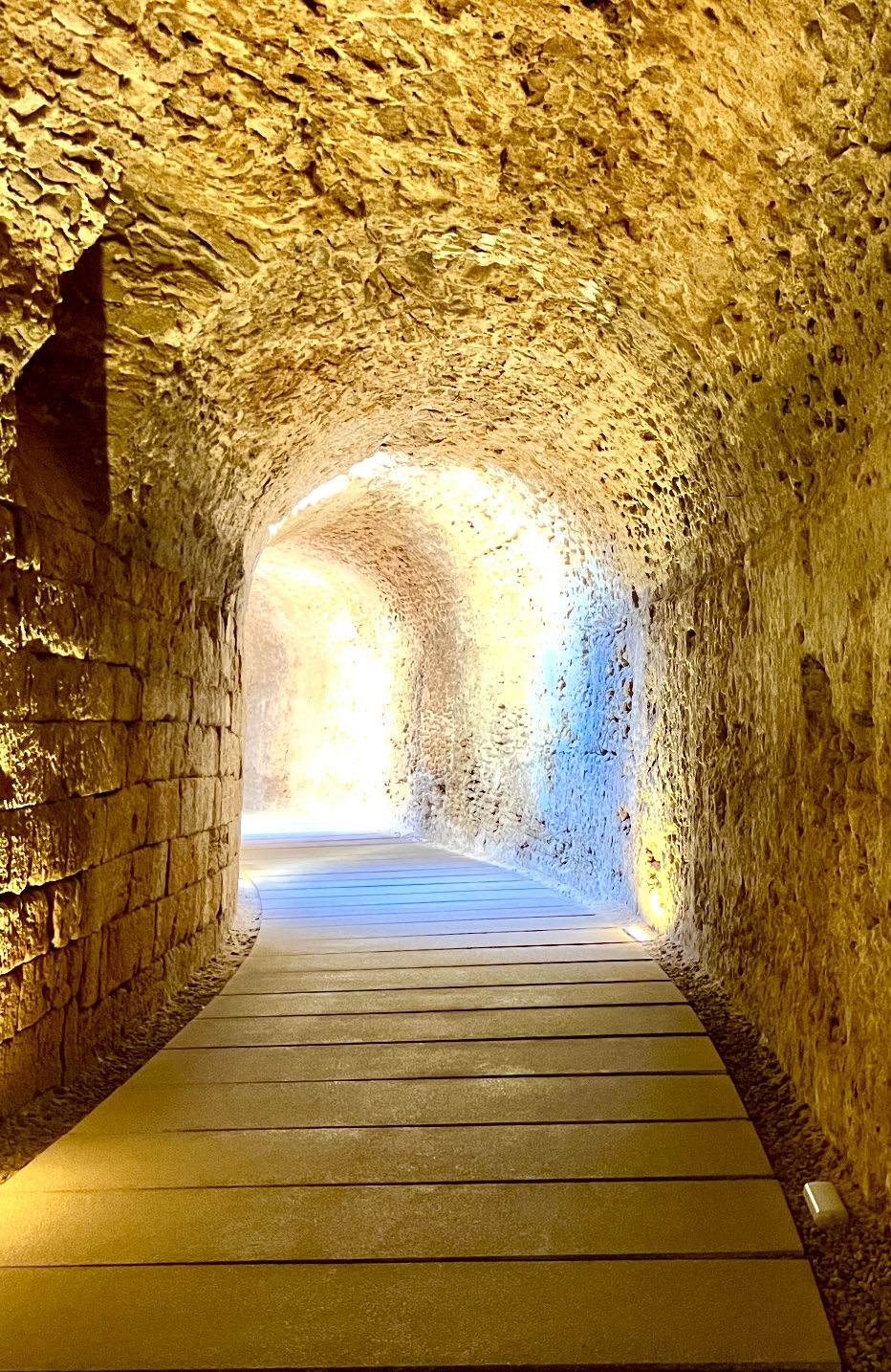 túnel que circunda o palco dum teatro romano em Cádiz. A luz fez estes belos