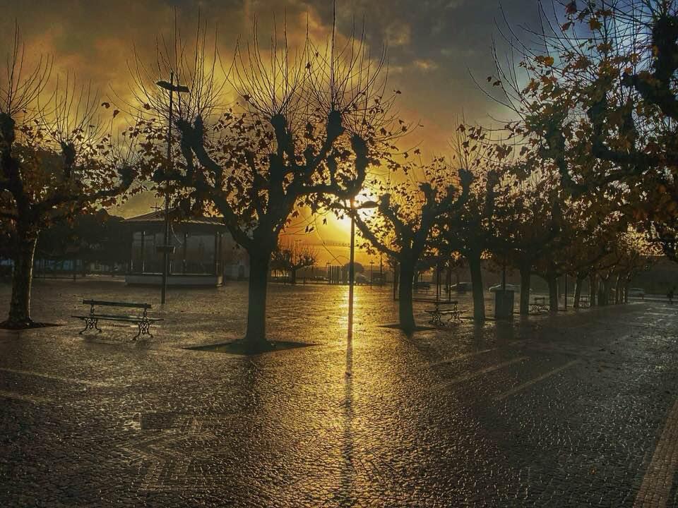 nascer do sol, numa Praça vazia e húmida.