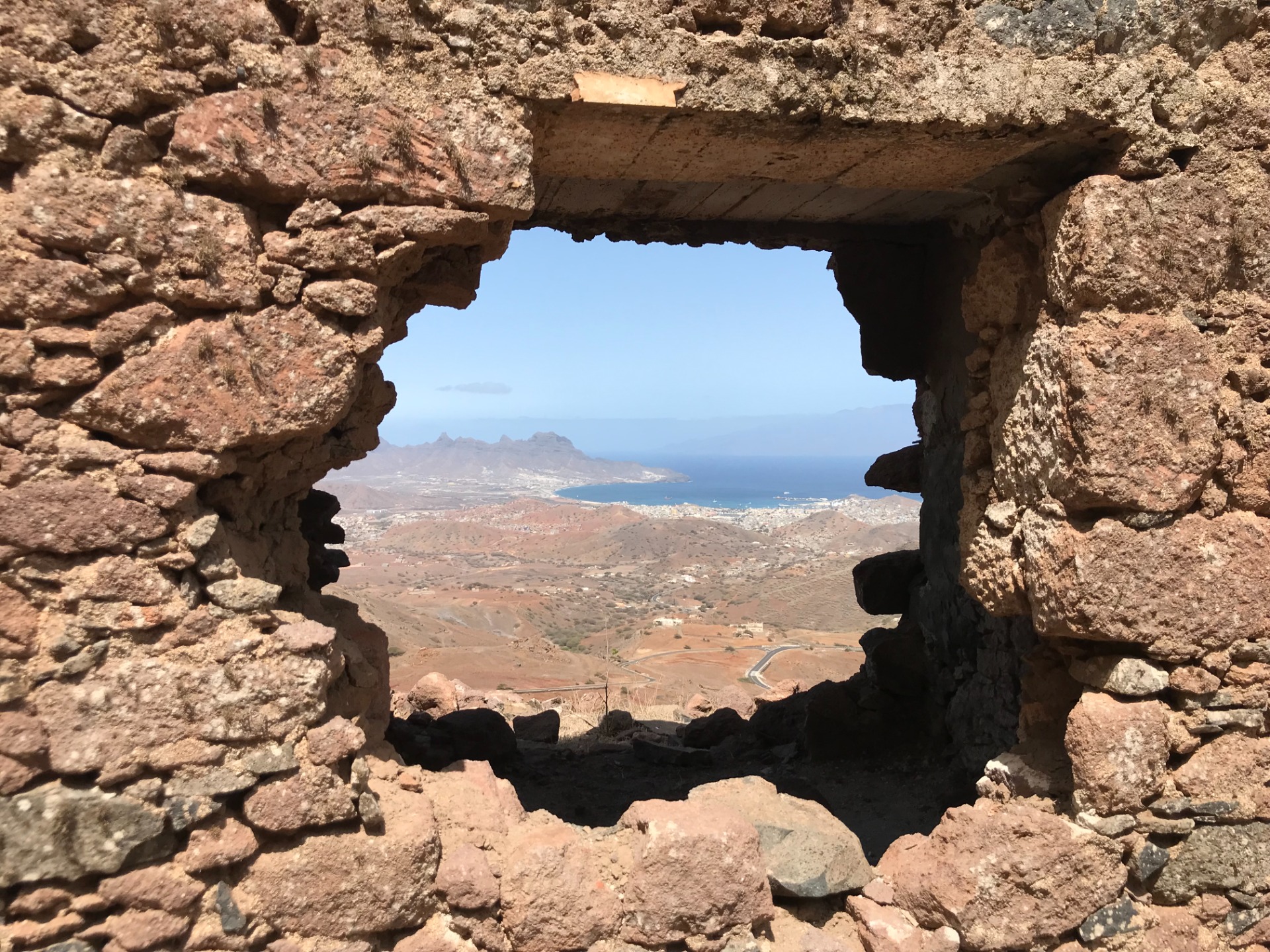 No centro da paisagem, a Baía e a Cidade do Mindelo ficam "emolduradas" pela