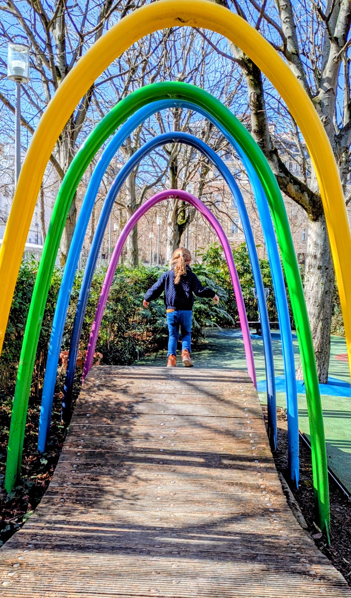 cidade, o contraste entre o arvoredo e os arcos coloridos, que decoravam o