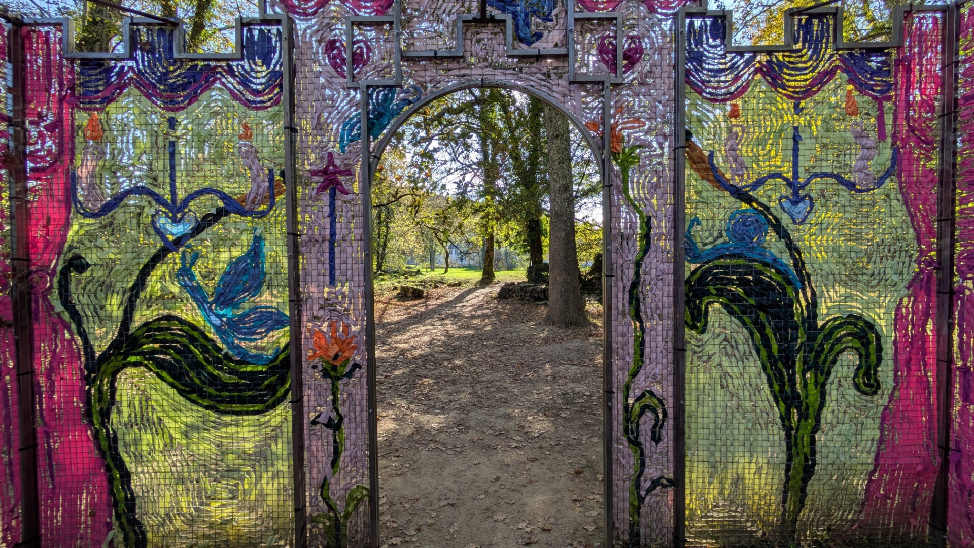 No parque da Abadia Escaladieu, nos Altos Pirinéus, há sempre exposições muito originais. Este ano, montaram um castelo imaginário, no meio da natureza. Era feito de arame e fitas de todas as cores, a imitar um jardim em pleno verão. Ao entrar no castelo, podíamos observar, olhando para o exterior, as arvores seculares, perfeitamente enquadradas pelas paredes do colorido e fantástico castelo. Mas, fechando um pouco os olhos, o quadro artificial confundia-se com a natureza… a verdadeira obra de arte. Foi o que tentei fotografar: uma ilusão.