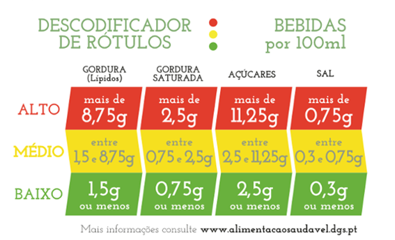 Para as bebidas (por 100ml), os limites são mais restritos, sendo considerado um teor "Alto" (Vermelho) quando a gordura ultrapassa os 8,75g, o açúcar os 11,25g ou o sal os 0,75g.